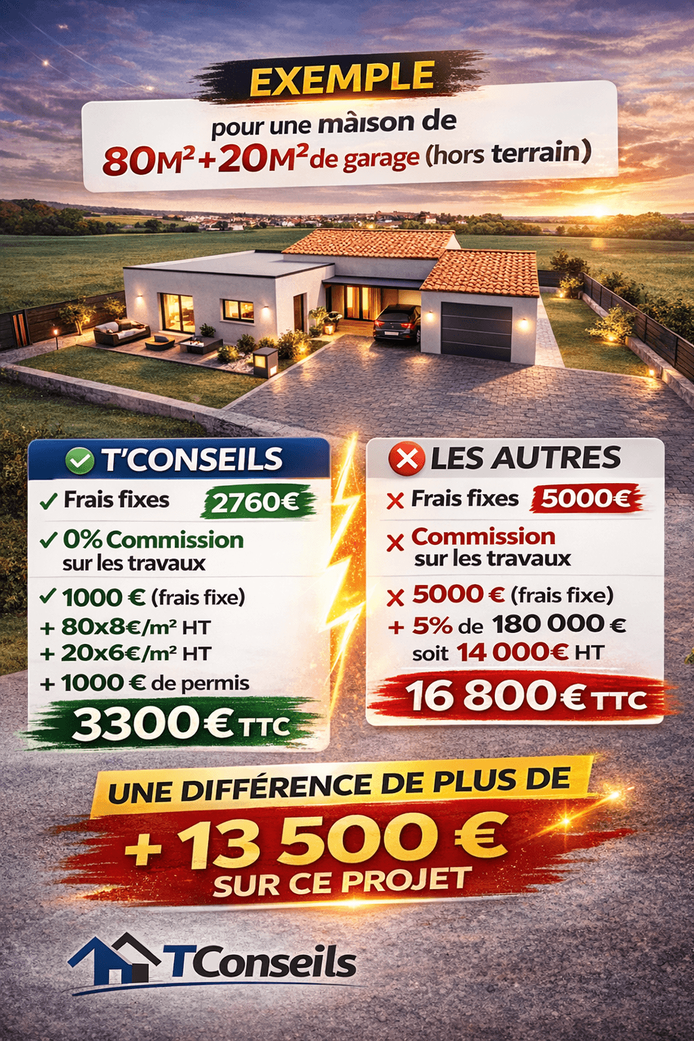 La différence T’Conseils : Nous ne travaillons pas sans validation. Vous ne payez que pour votre projet, au coût réel de 2 000 €. C’est une économie immédiate de près de 4 500 €.